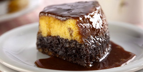 Despeje com cuidado e devagar sobre o bolo e leve ao forno médio, preaquecido, em banho-maria, por 1 hora.